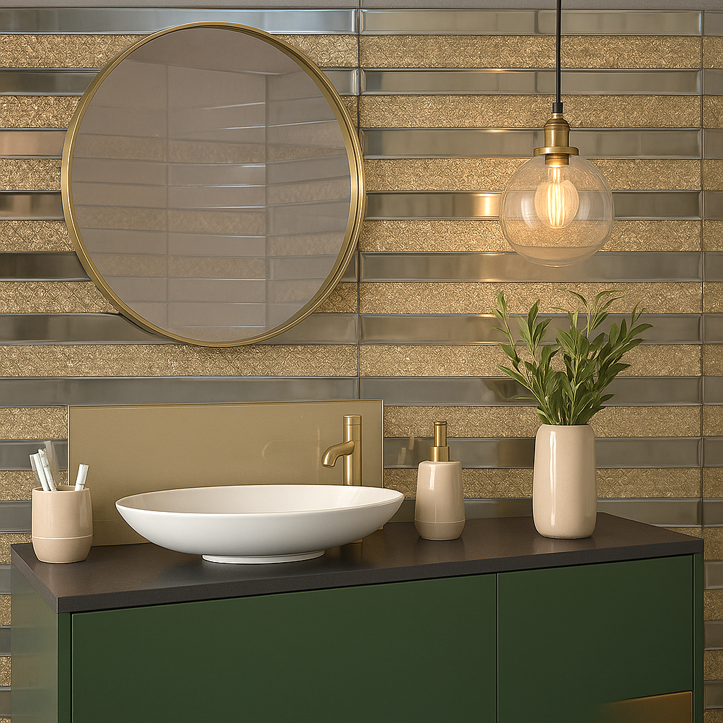 Gold Designed Beautiful Glass mosaic tiles are the perfect blend of style and functionality, bringing a touch of elegance and sophistication to any space. Ideal as an eye-catcher in the bathroom. Whether in the shower, over the sink, or on a bare wall; the tile makes a good picture everywhere. It can also be used in the kitchen as a backsplash.