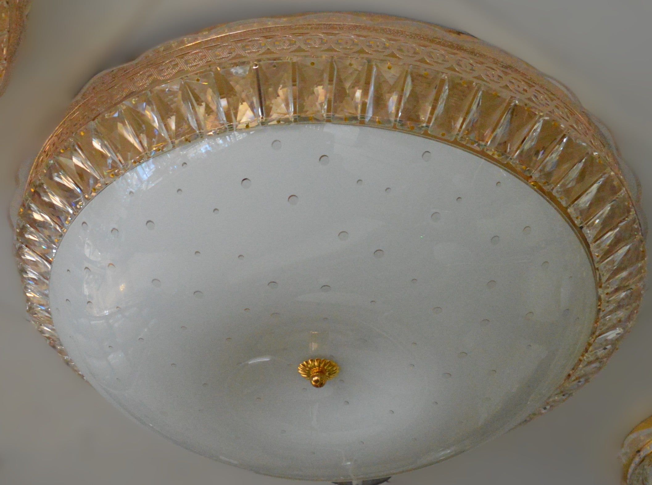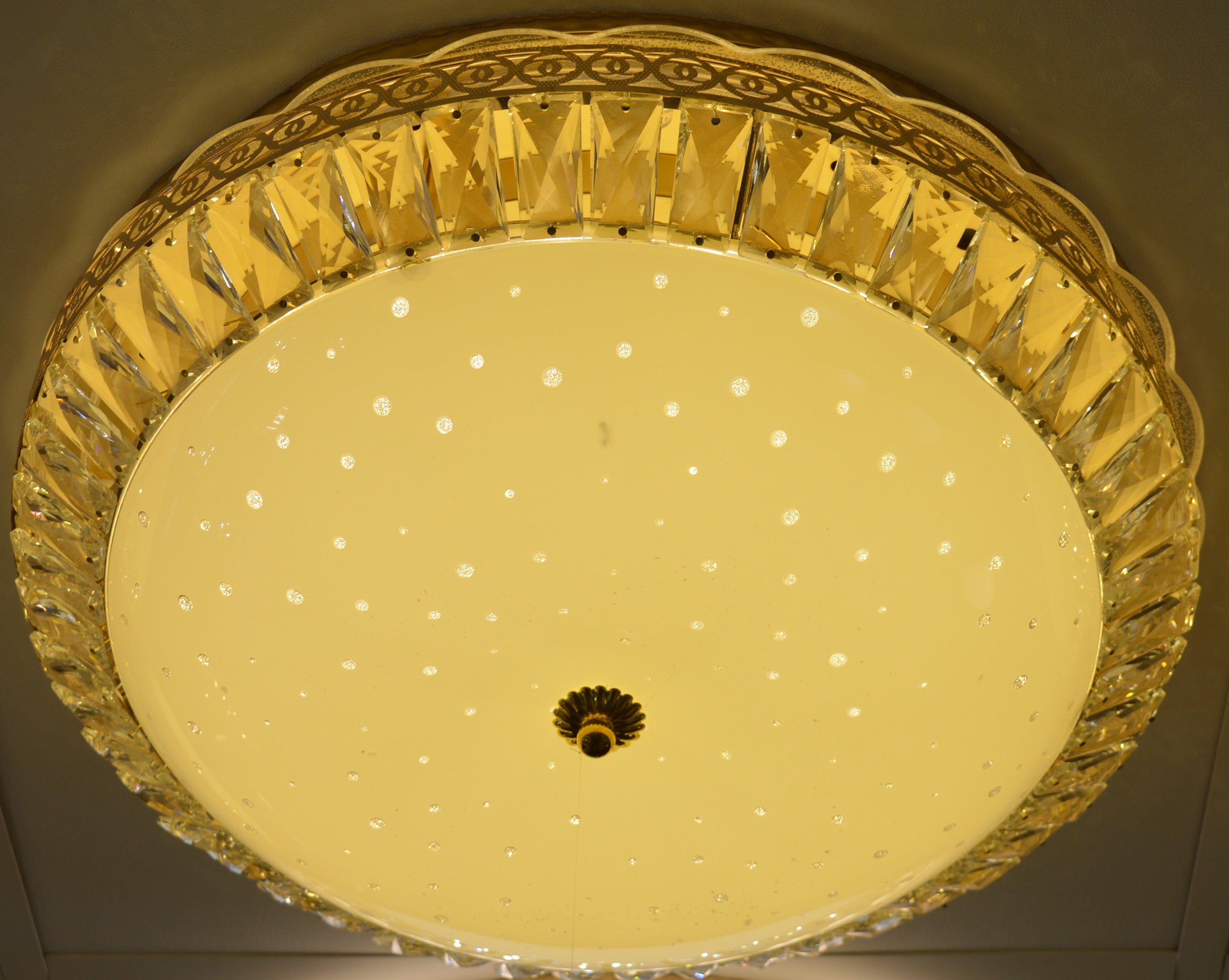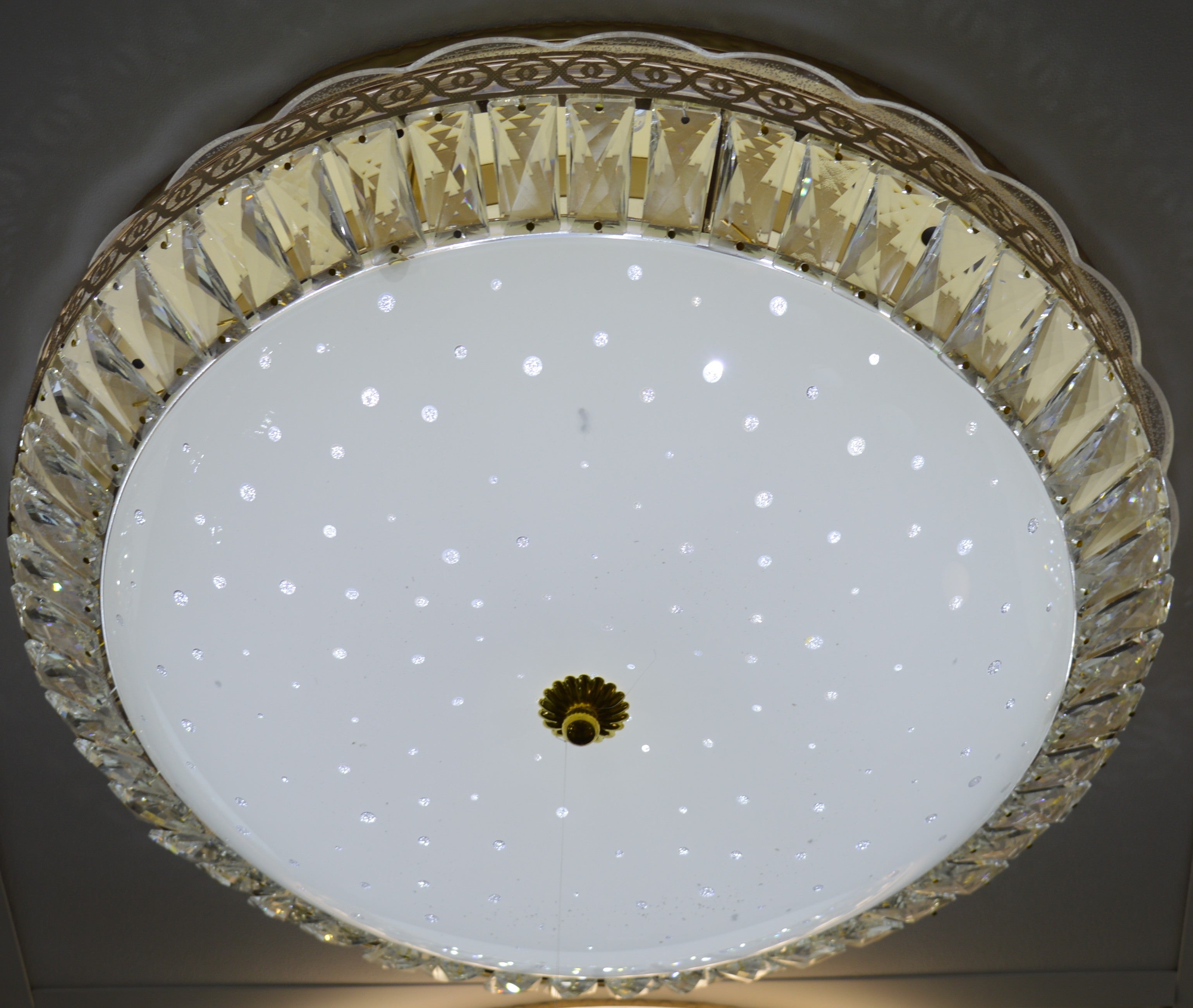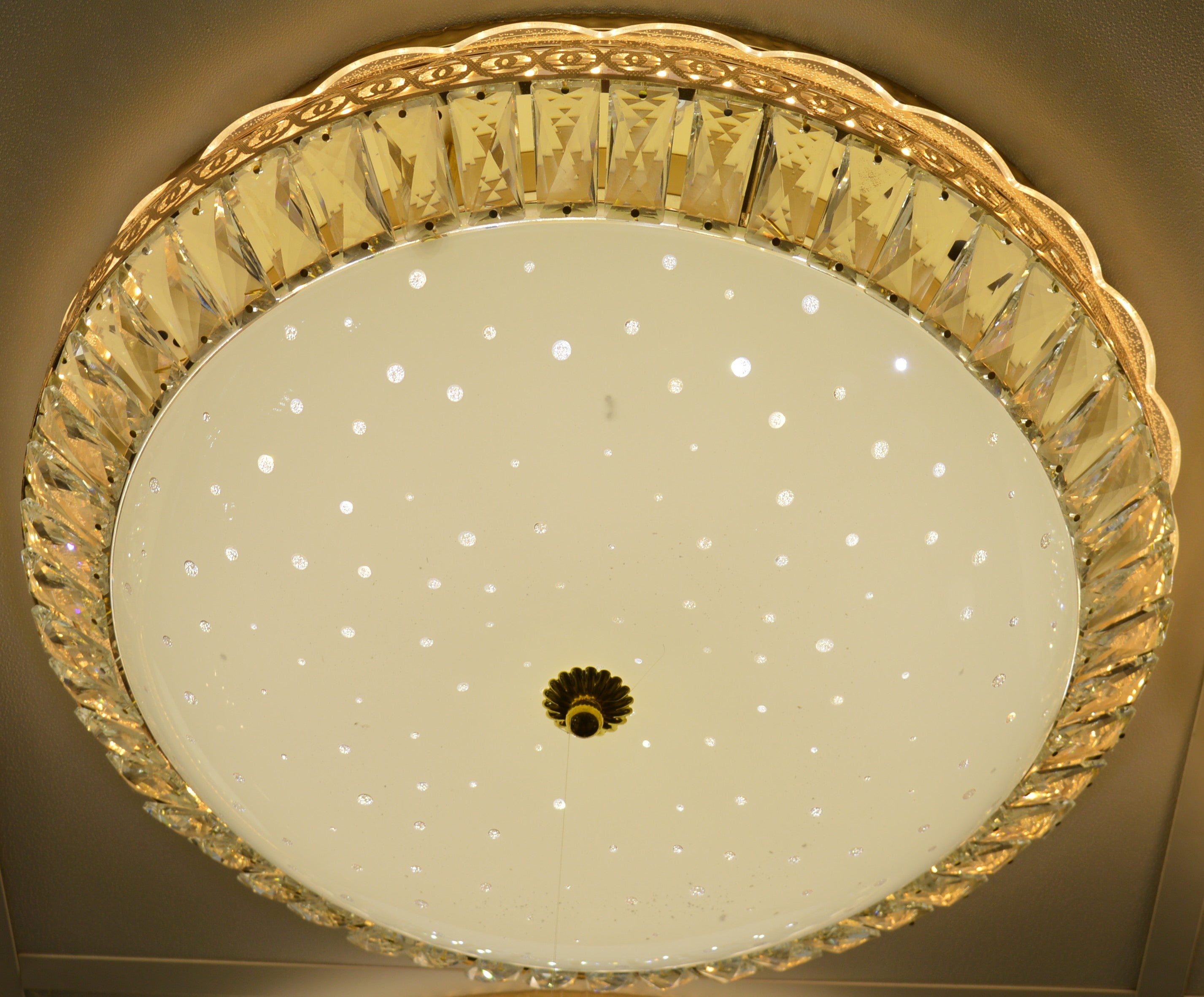 Ø The outer ring is decorated with high-quality faceted crystal prisms, which reflect and scatter the light to produce a sparkling, premium glow. The centre panel features micro-LED star points embedded in frosted glass, giving a magical sky-like appearance when switched on. This combination provides both strong main lighting and soft ambient illumination.