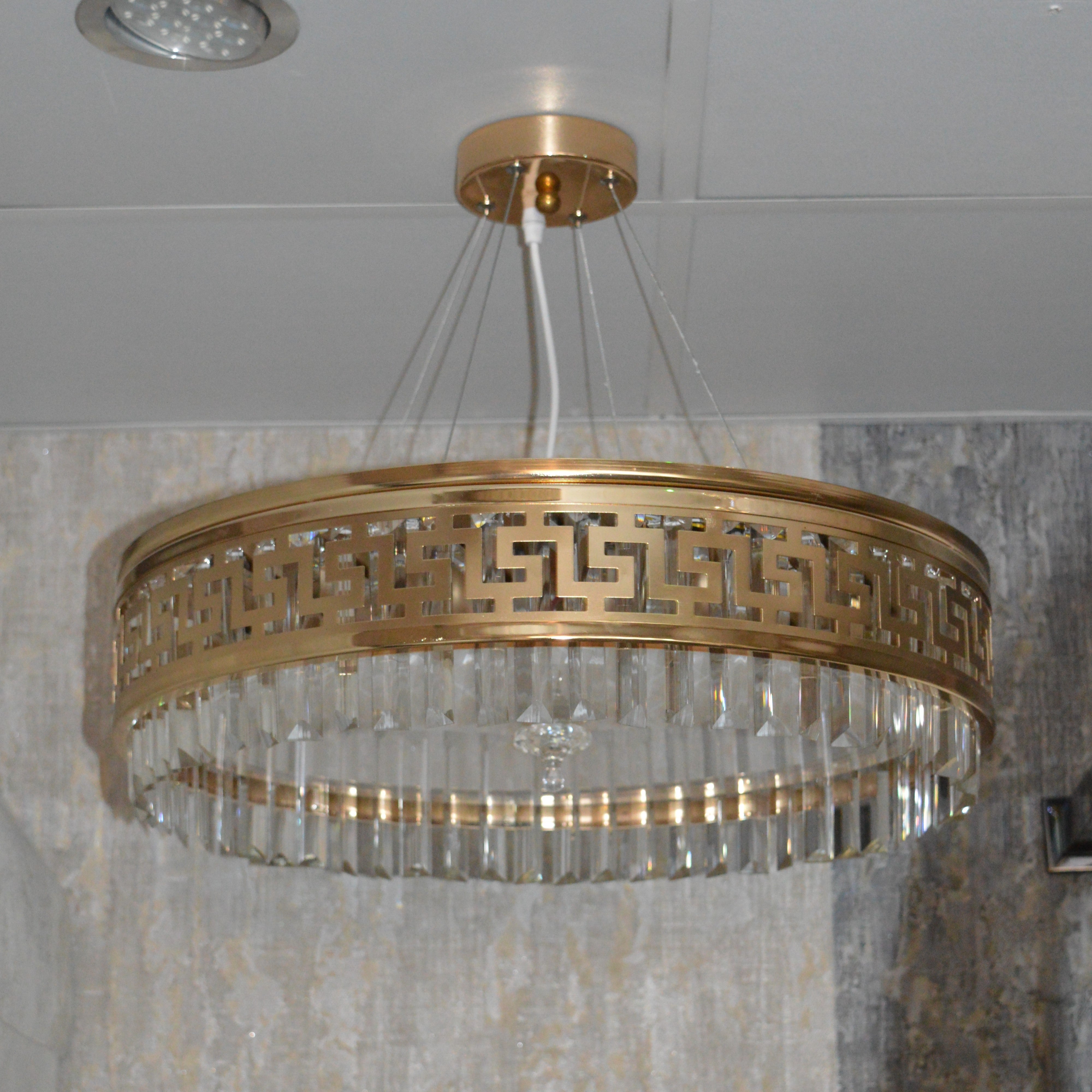 Bring luxury, elegance, and brilliance into your home or commercial space with this stunning gold crystal LED chandelier. Designed with a modern Greek-key pattern metal frame and high-clarity crystal prisms, this ceiling light creates a breath-taking sparkle while providing powerful, even illumination.
